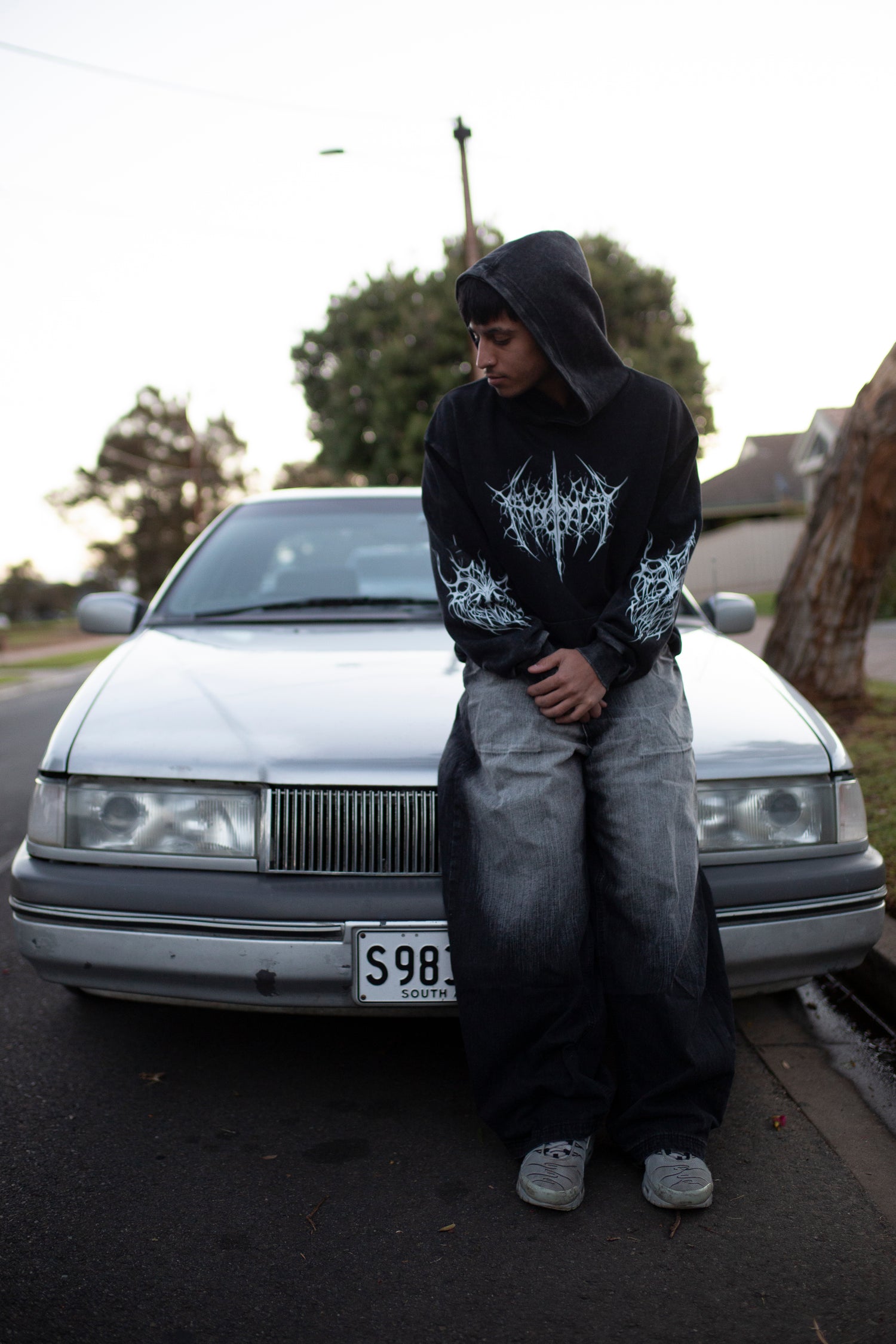 The hoodie has a relaxed, slightly oversized streetwear fit.